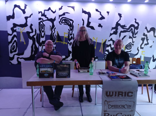 Die Menge an Menschen, von denen ich schon gehört hatte oder mit denen ich schon virtuell Kontakt hatte, war geradezu beängstigend. Ich traf sofort auf die Vögte und Heike Knopp-Sullivan (die ich mit Maske zunächst gar nicht erkannte). Und auf Jürgen vom Amrûn-Verlag, unser Held des Jahres, der er unserer Steampunk-Anthologie ein Zuhause gegeben hat und sie auch rechtzeitig zum BuCon herausgebracht hatte, so dass alle sie kaufen und wir sie signieren konnten. Da einige der Autor:innen vor Ort waren, konnte man sich bis zu sieben Unterschriften (von fünfzehn) holen, plus eins, wenn man noch eine vom Cover-Artist Christian Günther wollte.